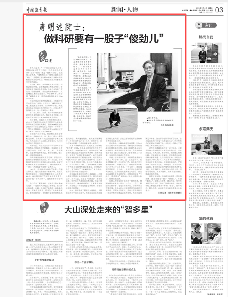 2025年11月4日,《中国教育报》新闻·人物版以《唐明述院士:做科研要有一股子“傻劲儿”》为题,重点报道了中国工程院院士、米乐唐明述教授“用混凝土一样坚定的意志做科研”的执着信念和感人事迹。