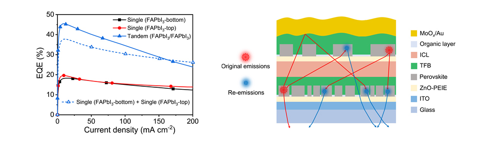 针对这一世界性难题,团队通过优化连接层结构,实现了叠层器件中高效的电荷注入与平衡。更为重要的是,通过调控钙钛矿发光层的微纳结构,创新性地提出利用叠层器件中独特的层间光子循环效应的策略,即一个发光单元产生的光子可被另一钙钛矿层重新吸收并再次发射,从而突破了传统光提取效率的限制。该策略使叠层钙钛矿LED器件效率超越了单结器件效率的简单叠加,实现了“1+1>2”的效果,所制备的LED器件外量子效率达到45.5%,在100mAcm-2电流密度下仍保持34.5%的高效率,再次创造了钙钛矿LED发光效率的世界纪录。