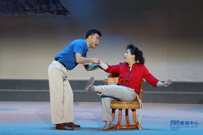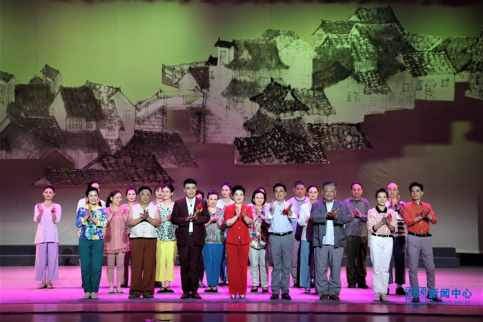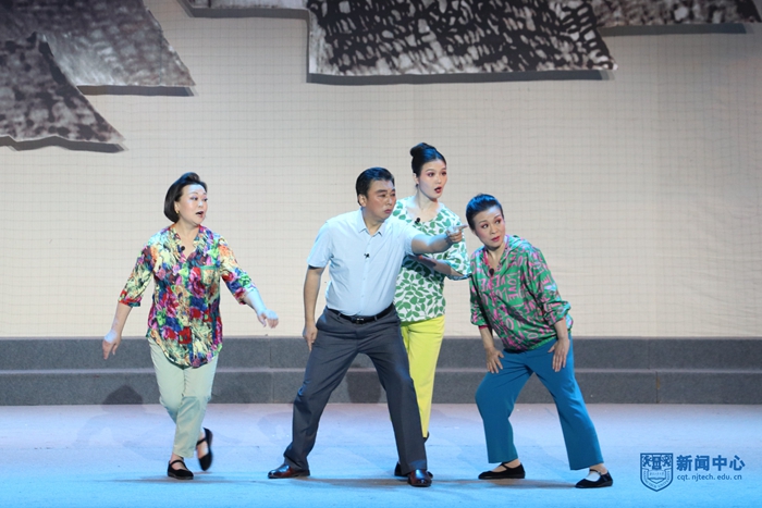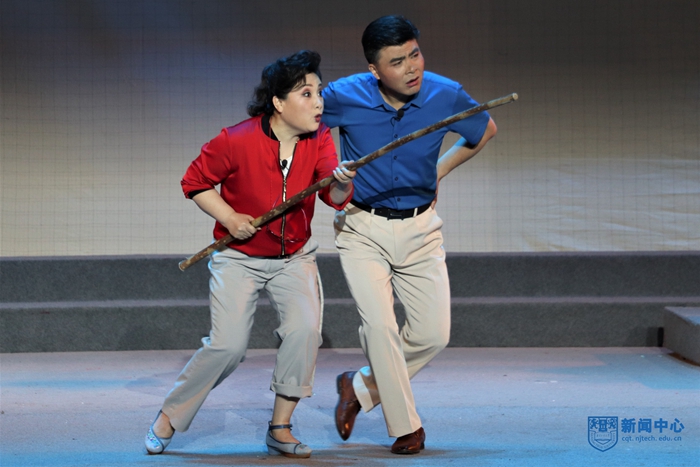 《村里来了花喜鹊》讲述了一个极具苏北乡村特色的文化脱贫故事。作为江苏省首部扶贫大戏,本剧用轻喜剧的形式展示脱贫扶贫这一宏大时代背景,由国家一级演员、中国戏剧家协会会员、第28届上海白玉兰戏剧表演艺术配角奖榜首获得者——许晴扮演主角花喜鹊。表演者正宗的淮剧唱腔及富有趣味的动作表演引得师生们掌声连连,精彩表演深深打动现场观众。此外,主演老师们现场邀请观众上台学习淮剧的唱腔和身段,加深大家对淮剧的了解。