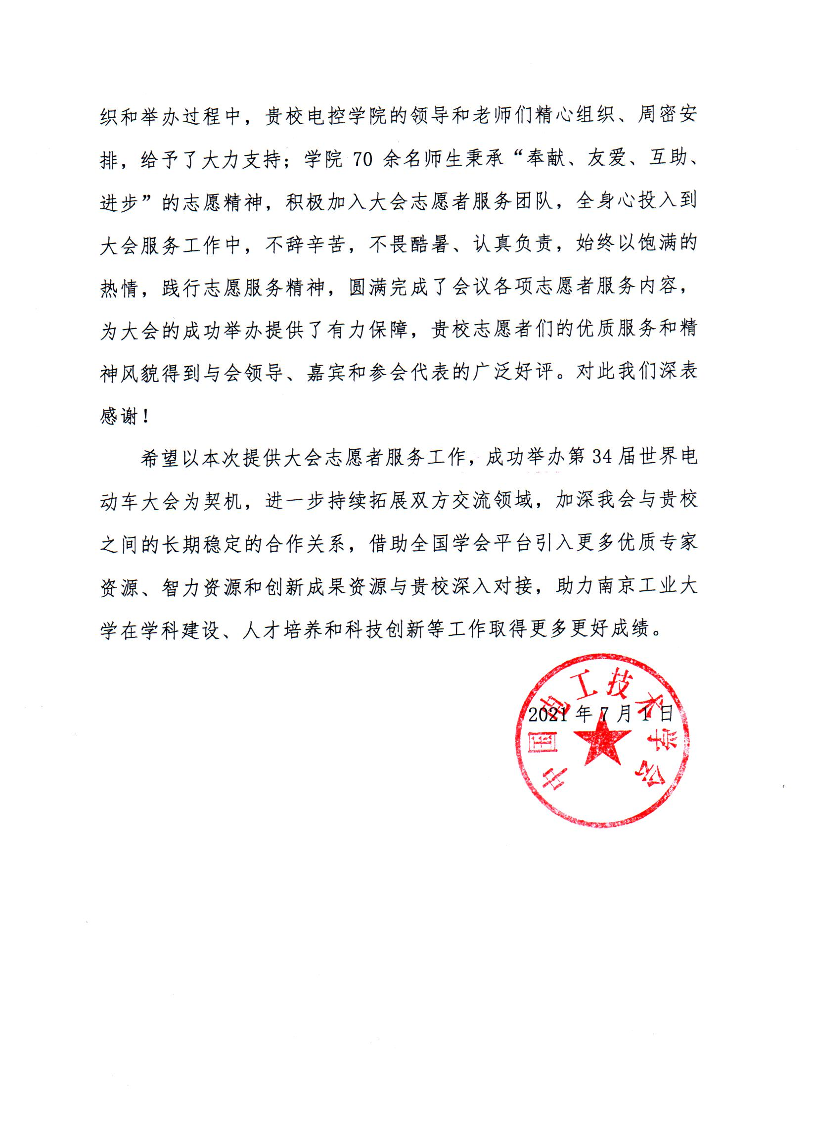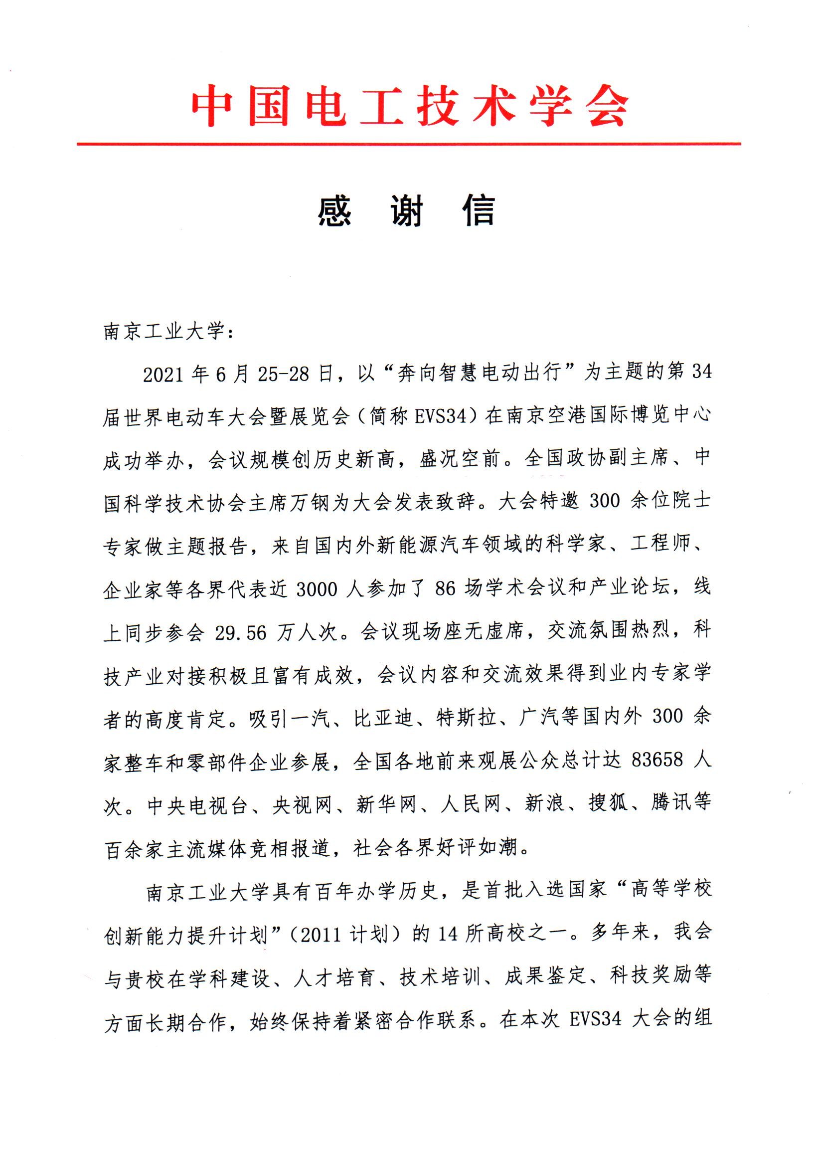 近日,中国电工技术学会向米乐发来感谢信,感谢米乐电控学院师生在第34届世界电动车大会暨展览会中做出的贡献。