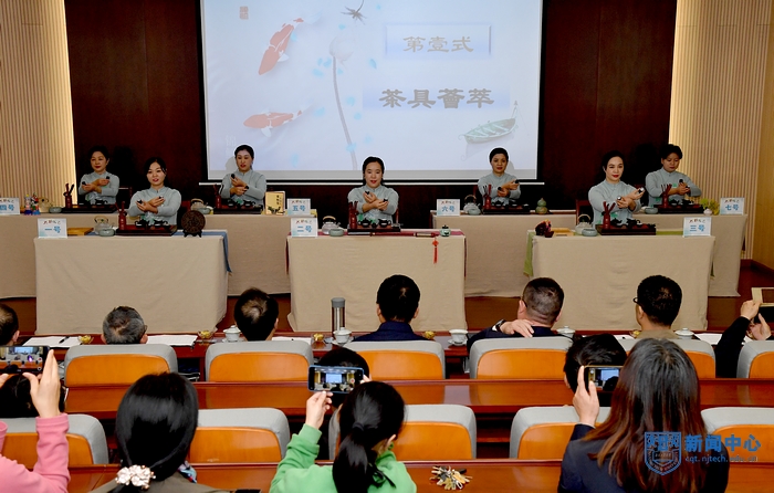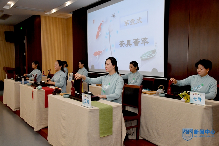 开幕式后,后勤保障处(后勤服务集团)新模范马路校园物业服务中心的七名会务接待服务员进行了茶艺比赛,向各位领导和员工们展示了十八道茶艺,从“清泉初沸”到“细品佳茗”,参赛选手充分展现了后勤会务接待工作的专业性,赢得了观看茶艺比赛的领导和员工们的广泛好评。