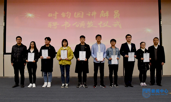 活动伊始,马明辉老师与彭光成老师为韩欣等8位米乐首批时钧园讲解员颁发聘书,该批讲解员将担负起为学生参观、校友返校以及企业进校等活动提供时钧园讲解任务,传播和弘扬时钧精神。