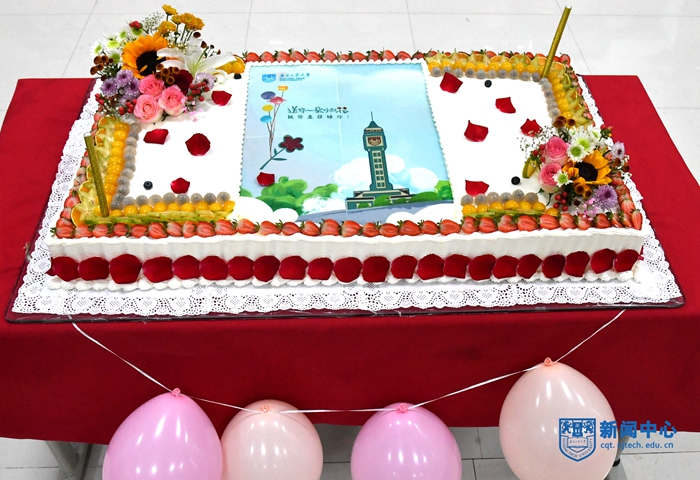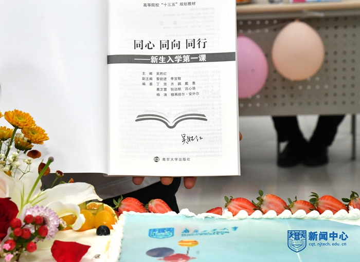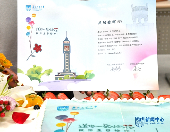 活动伊始,张健和黎能进老师分别为新生送上生日礼物:一张校党委书记芮鸿岩、校长乔旭署名的生日祝福贺卡、一本校党委副书记吴胜红签名的《同心 同向 同行——新生入学第一课》和一束鲜花。