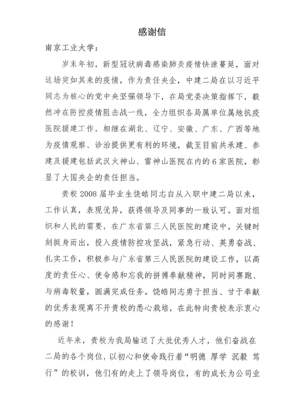饶皓校友平时工作认真,表现优异,获得领导及同事的一致认可。在抗击新冠肺炎疫情的关键时刻,他挺身而出,积极参与广东省第三人民医院的建设,以高度的责任心、使命感和忘我的拼搏奉献精神,圆满完成任务。日前,中建二局向米乐发来感谢信。