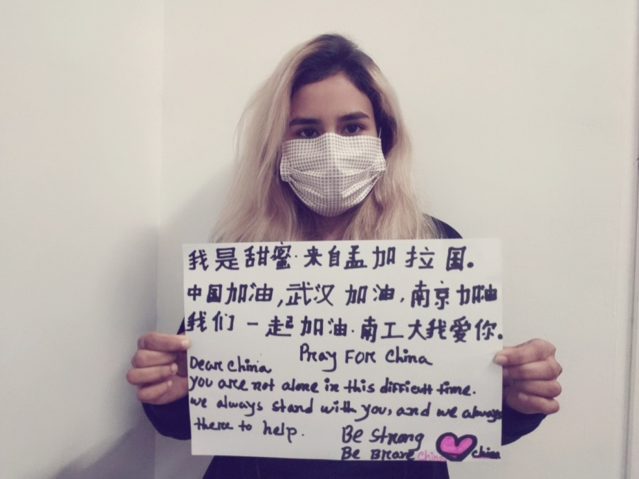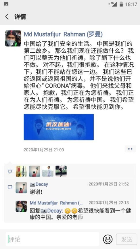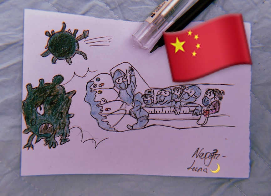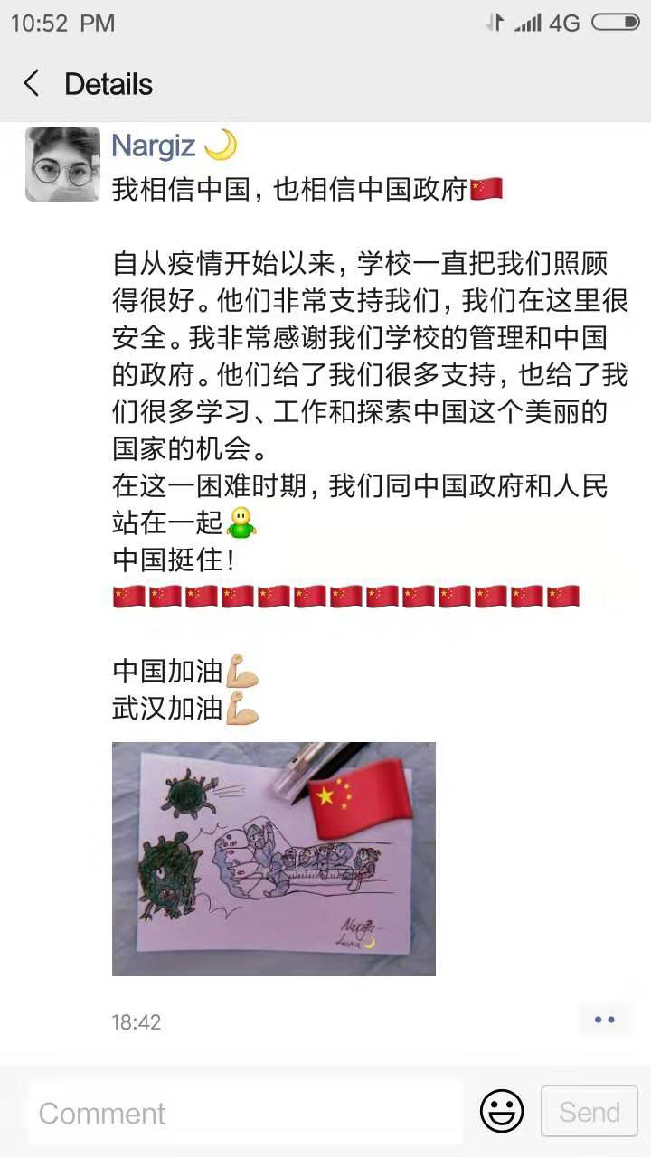 不仅如此,很多同学都在自己的朋友圈表达了对中国早日战胜病毒的信心,来自哈萨克斯的2017级Nargiz Kamalova同学和来自孟加拉的2018级AKTER同学还创作了绘画作品来为中国加油!