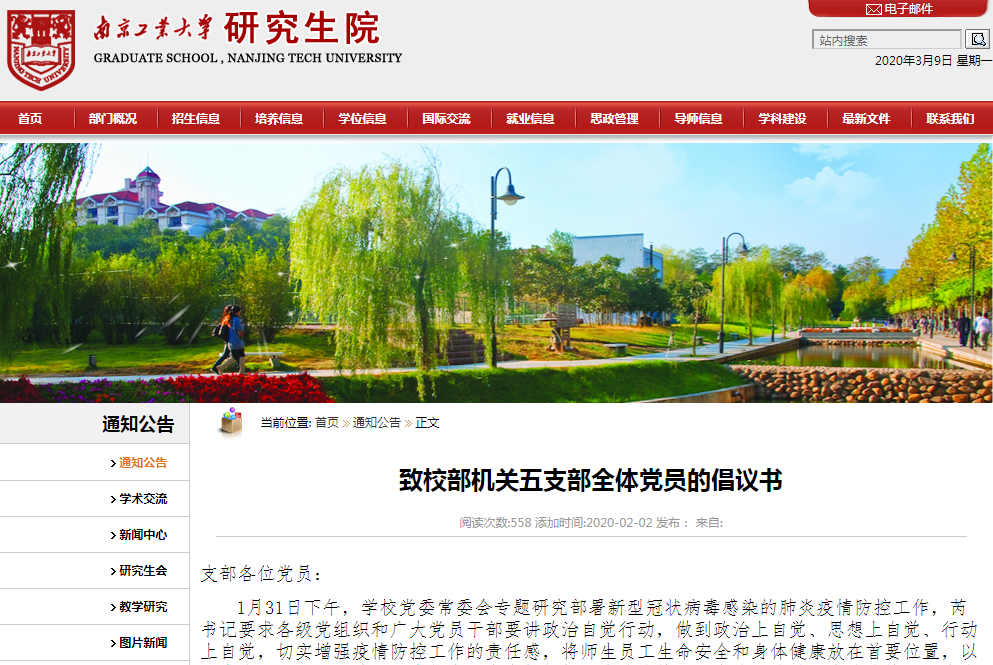 2月1日,研究生院发出“致校部机关五支部全体党员的倡议书”,对研究生院全体党员发出了“战前集结令”,充分发挥党支部战斗堡垒作用。