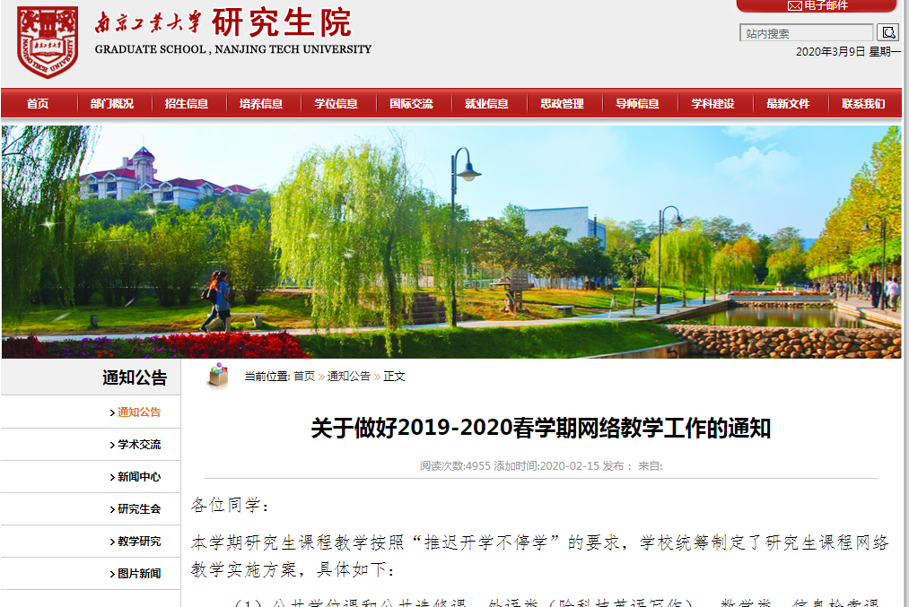 学校要求各学院和任课教师在制定网络教学计划和布置研究生学习任务时,要充分考虑到研究生个人特殊情况,尤其对在疫区的同学要多加沟通,给予更多关怀,及时调整针对教学和学习方案,做到一生一方案,实施精准施教,把师生关怀送到学生心中。