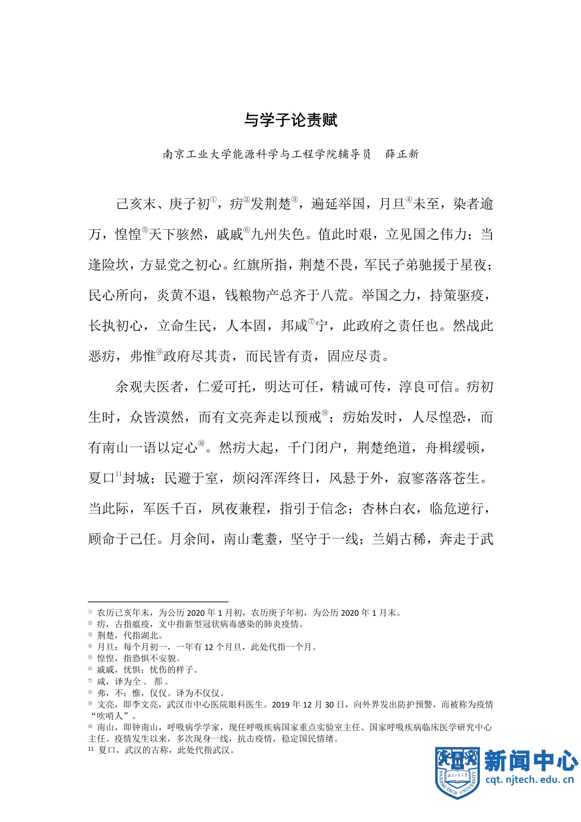 战“疫”暖心事┃辅导员薛正新创作文言文《与学子论责赋》