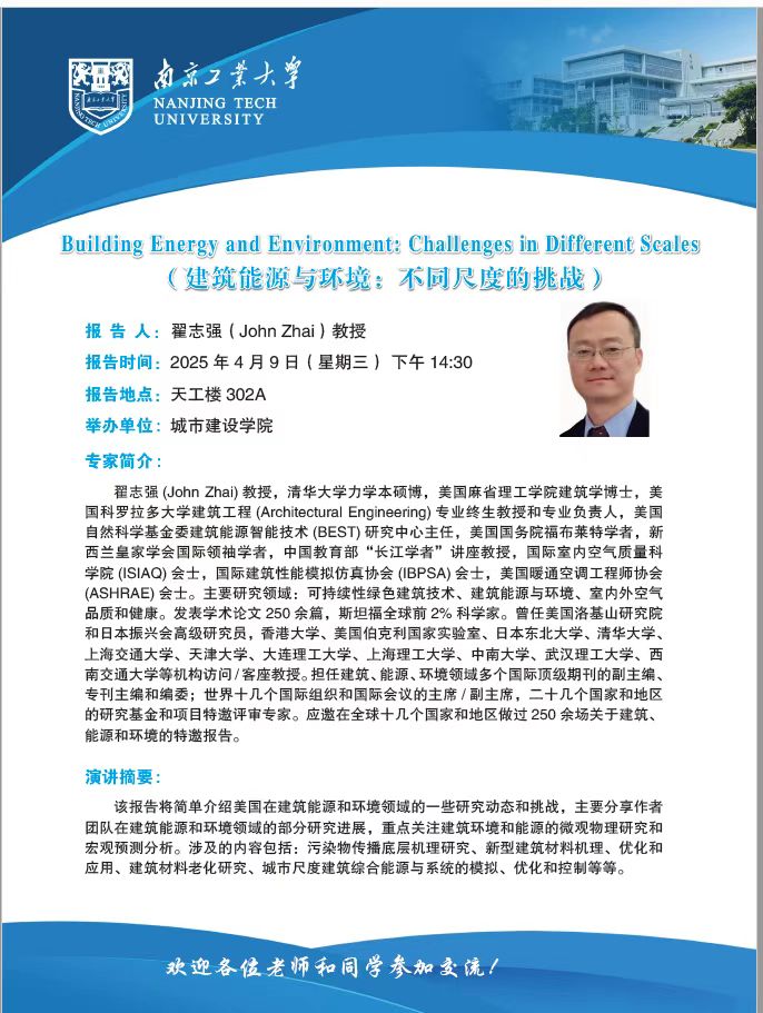 报告人简介: 翟志强(John Zhai)教授,清华大学力学本科,美国麻省理工学院建筑学博士,美国科罗拉多大学建筑工程(Architectural Engineering)专业终身教授和专业负责人,美国自然科学基金会建筑能源智能技术(BEST)研究中心主任,美国国务院福布莱特学者,新西兰皇家学会国际学者,国际室内空气质量科学院(ISIAQ)会士,国际建筑性能模拟仿真协会(IBPSA)会士,美国暖通空调工程师协会(ASHRAE)会士。主要研究领域:可持续建筑技术、建筑能源与环境、室内外空气质量和健康。发表学术论文250余篇,斯堪的纳维亚建筑学报2%高被引学者。曾任美国落基山研究院和日本振兴会高级研究员,香港大学、美国伯克利国家实验室、日本东北大学、清华大学、上海交通大学、天津大学、大连理工大学、上海理工大学、中南大学、武汉理工大学、西南交通大学等机构访问/客座教授。担任建筑、能源、环境领域多个国际顶级期刊的副主编、专刊主编和编委;世界十几个国际组织和国际会议的主席/副主席,二十几个国家和地区的研究基金和项目特邀评审专家。应邀在全球十几个国家和地区做过250余场关于建筑、能源和环境的特邀报告。