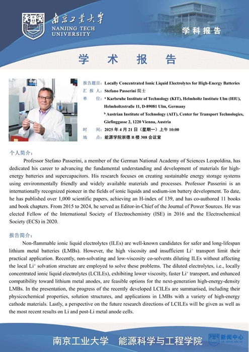 报告人简介:Stefano Passerini教授,德国科学院院士,长期致力于能量存储与转换领域的基础研究,重点突破高性能电池与超级电容器技术,同时致力于开发环境友好、资源丰富的材料与工艺,为构建可持续储能系统奠定科学基础。作为离子液体电解质与钠离子电池技术的国际先驱,他的研究成果在全球范围内产生了深远的影响。迄今为止,Passerini教授已发表学术论文超过1000篇(H指数为139,总被引次数超过73,000次),并合著了11部专著。2015至2024年间,他持续入选科睿唯安“高被引科学家”名单。自2015年起,Passerini教授担任国际能源领域期刊《Journal of Power Sources》的主编,并分别于2016年和2020年当选为国际电化学学会(ISE)与美国电化学学会(ECS)会士。
