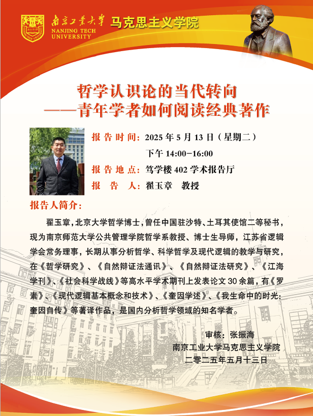 报告人简介:翟玉章,北京大学哲学博士,曾任中国驻沙特、土耳其使馆二等秘书,现为南京师范大学公共管理学院哲学系教授、博士生导师,江苏省逻辑学会常务理事,长期从事分析哲学、科学哲学及现代逻辑的教学与研究,在《哲学研究》、《自然辩证法通讯》、《自然辩证法研究》、《江海学刊》、《社会科学战线》等高水平学术期刊上发表论文30余篇,有《罗素》、《现代逻辑基本概念和技术》、《奎因学述》、《我生命中的时光:奎因自传》等著译作品,是国内分析哲学领域的知名学者。