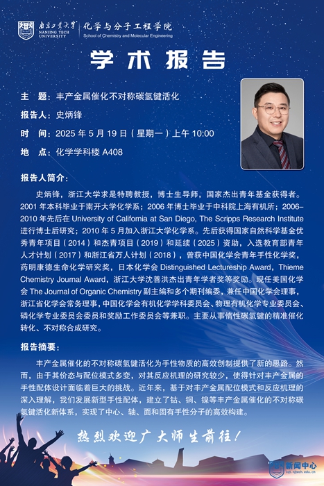 报告人简介:史炳锋,浙江大学求是特聘教授,博士生导师,国家杰出青年基金获得者。2001年本科毕业于南开大学化学系;2006年博士毕业于中科院上海有机所;2006-2010年先后在University of California at San Diego, The Scripps Research Institute进行博士后研究;2010年5月加入浙江大学化学系。先后获得国家自然科学基金优秀青年项目(2014)和杰青项目(2019)和延续(2025)资助,入选教育部青年人才计划(2017),曾获中国化学会青年手性化学奖,药明康德生命化学研究奖,日本化学会Distinguished Lectureship Award,Thieme Chemistry Journal Award,浙江大学沈善洪杰出青年学者奖等奖励。现任美国化学会The Journal of Organic Chemistry副主编和多个期刊编委,兼任中国化学会理事,浙江省化学会常务理事,中国化学会有机化学学科委员会、物理有机化学专业委员会、磷化学专业委员会委员和奖励工作委员会等兼职。主要从事惰性碳氢键的精准催化转化、不对称合成研究。