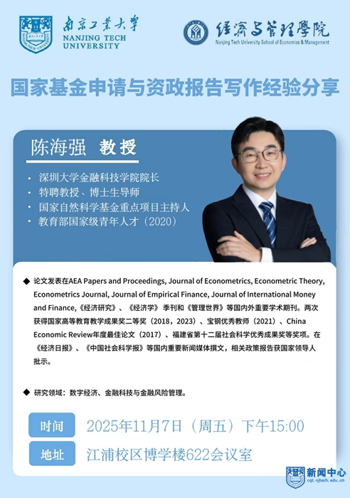 报告人简介:陈海强,美国康奈尔大学经济学博士,深圳大学金融科技学院院长、特聘教授、博士生导师,国家自然科学基金重点项目主持人(2项),教育部国家级青年人才(2020),福建省高等学校新世纪优秀人才,厦门市高层次引进人才。研究领域为数字经济、金融科技与金融风险管理。论文发表在AEA Papers and Proceedings, Journal of Econometrics, Econometric Theory, Econometrics Journal, Journal of Empirical Finance, Journal of International Money and Finance,《经济研究》、《经济学》 季刊和《管理世界》等国内外重要学术期刊。两次获得国家高等教育教学成果奖二等奖(2018,2023)、宝钢优秀教师(2021)、China Economic Review年度最佳论文(2017)、福建省第十二届社会科学优秀成果奖等奖项。在《经济日报》、《中国社会科学报》等国内重要新闻媒体撰文,相关政策报告获国家领导人批示。